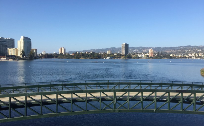 The bridge is quite new—part of the 2002 Measure DD work—finished in 2012 after a century old culvert was ripped out and the water allowed to flow free. The water underneath connects the lake to the bay, the bay to the hills. The bridge connects people from East Oakland to the Lake Merritt Amphitheater, downtown and beyond.