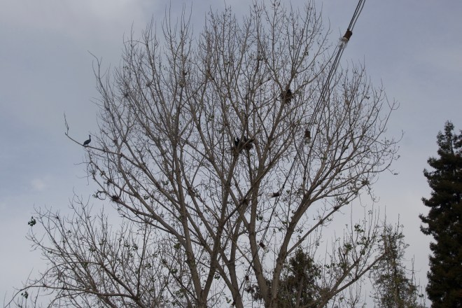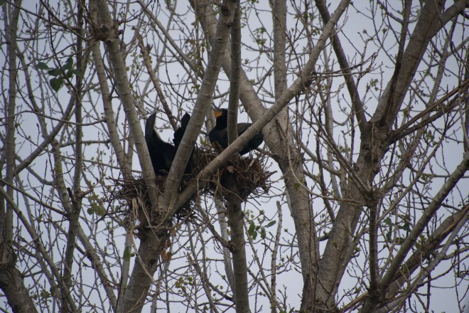 But after our big rain last week, I found that maybe half a dozen cormorants are nesting in the tree — and several in a new tree further to the east.